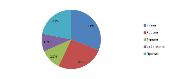 Ключевым импортером тканей в Казахстан остается Китай с 31% - доля его сохранилась с 2010 года на прежнем уровне. Доля России в 2014 году составила 26%, доля Турции – 11%.