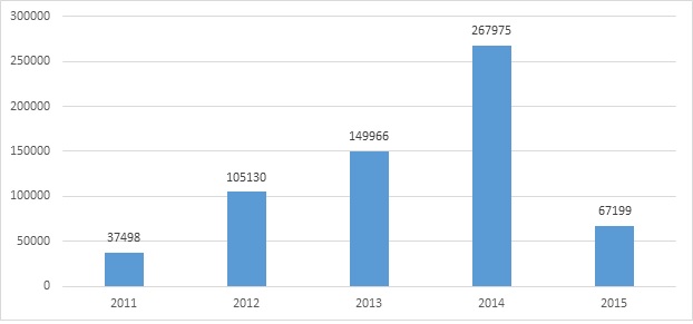 До резких изменений валютного курса тенге по отношению к доллару США, связанных с изменениями цен на нефть и прекращением интервенций ЦБ Казахстана, наблюдался устойчивый рост импорта легковых автомобилей (диаграмма 5, 6). С 2011 по 2014 год импорт увеличился более чем в 6 раз в натуральном выражении и более чем в 3 раза в денежном выражении. Однако в 2015 году наблюдается резкий спад данных показателей.