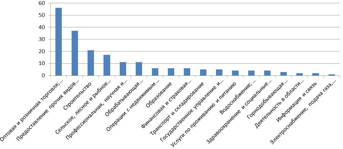 | 8 | Оптовая и розничная торговля; ремонт автомобилей и мотоциклов | 56 | 7,69 | 52 |