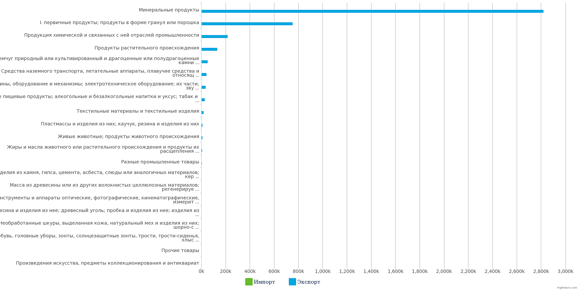 Главным экспортируемым товаром в торговых сделках Казахстана являются "Минеральные продукты", что характеризует сырьевую направленность экономики РК. Минеральные продукты занимают 68,0% в общем объеме экспорта Казахстана за май 2017 г.